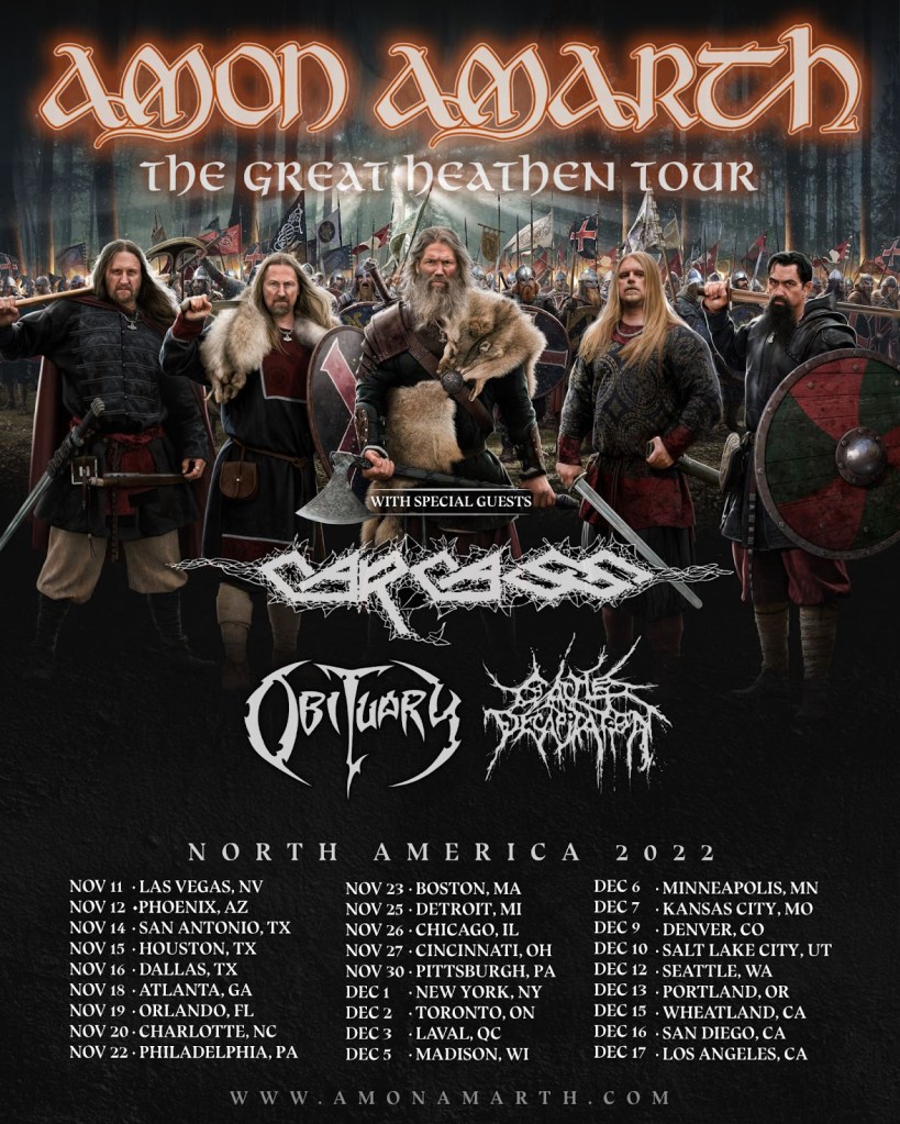 The Great Heathen Tour lands on the shores of North America in November of 2022. Amon Amarth are bringing with them on this quest… Are you ready?! Carcass, Obituary, and Cattle Decapitation. This is an incredible Death Metal line-up, and is sure to be an awesome show! Your girl, The Saw, will be in Charlotte, NC (at the Fillmore) on November 20 for the beatings! Will you be there?!