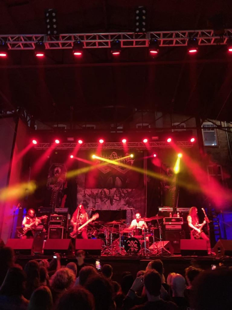As we entered the gates, the club opens-up into a courtyard; a mid-sized open-air layout, surrounded by food and drink venders and merch tables. Buildings lined the perimeter of the festival-feeling venue, and the longest line in the courtyard was for Cannibal Corpse merch! A (higher than normal) stage ensured a good view from anywhere in the courtyard. Jannas Live! has a 2,000 capacity, and by the time the show started, most of that cap had been reached.